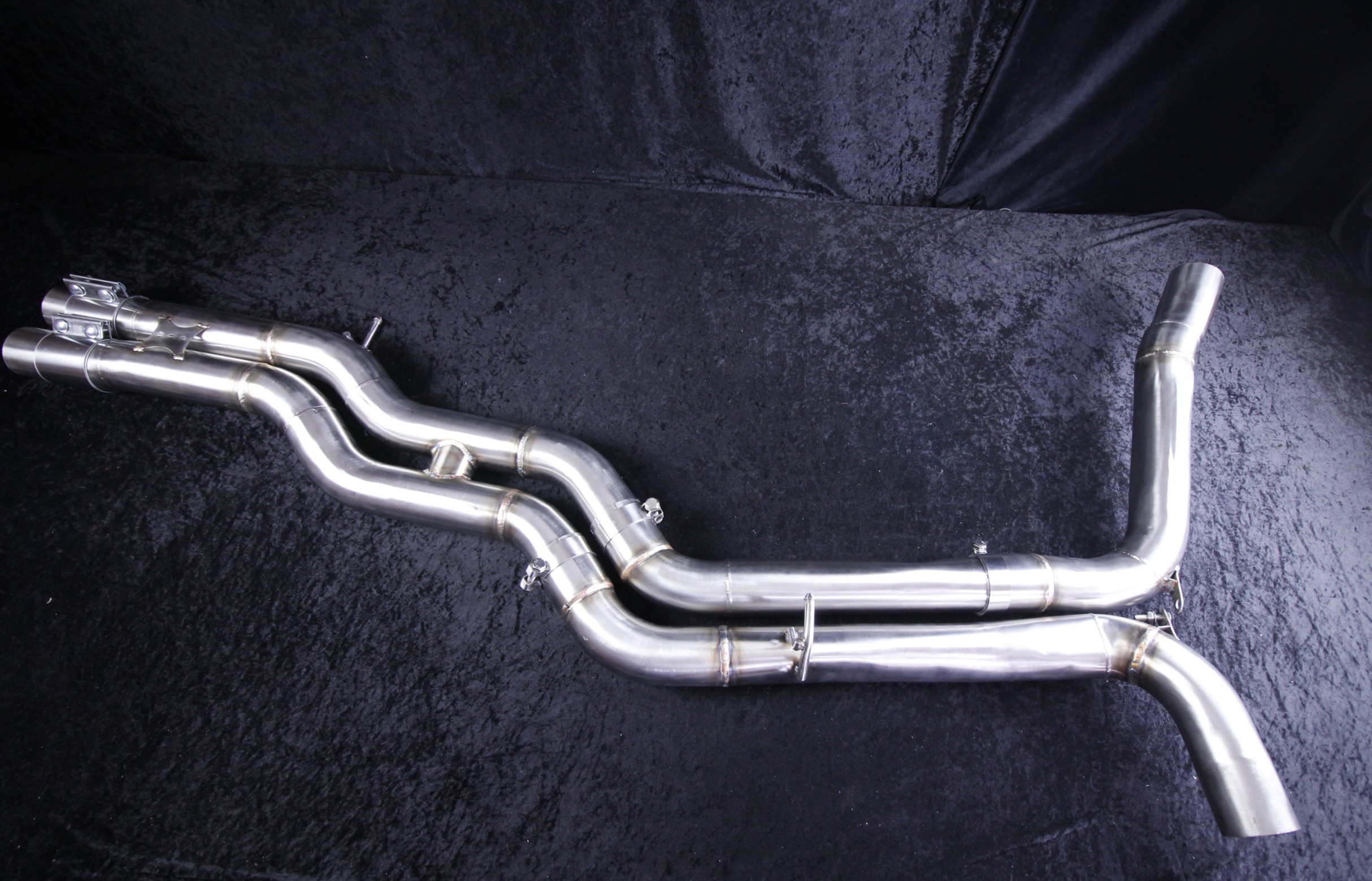 • Handmade using T304L Grade stainless steel. The system is constructed using 3”ø pipe work, featuring a twin pipe centre section, resonator delete, centre silencer replacement and valved rear silencers.